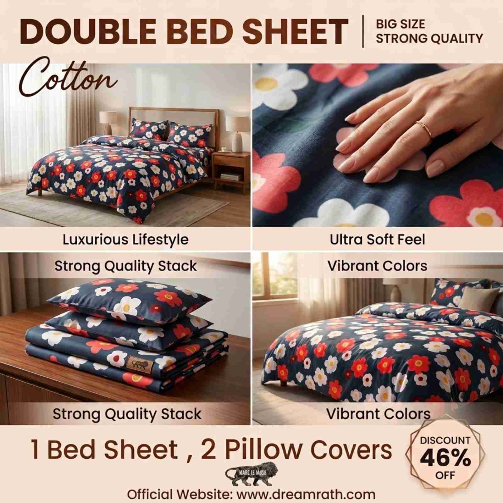Premium cotton double bed sheet with 2 pillow covers, crafted for comfort, style and cozy bedroom